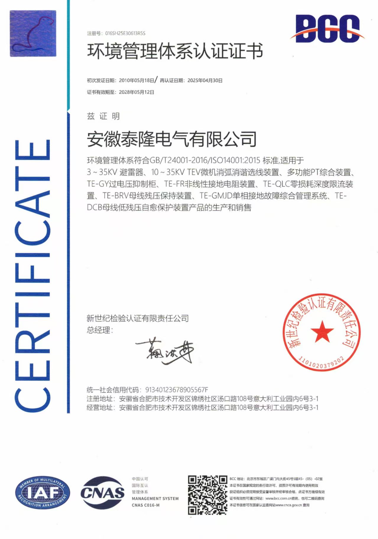 环境管理体系认证证书